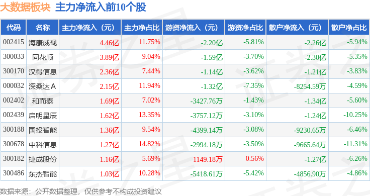从资金流向上来看,当日大数据板块主力资金净流出32.87亿元,游资资金净流入3.91亿元,散户资金净流入28.96亿元。大数据板块个股资金流向见下表: