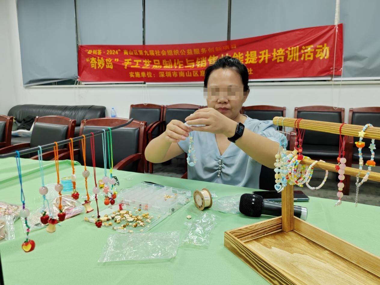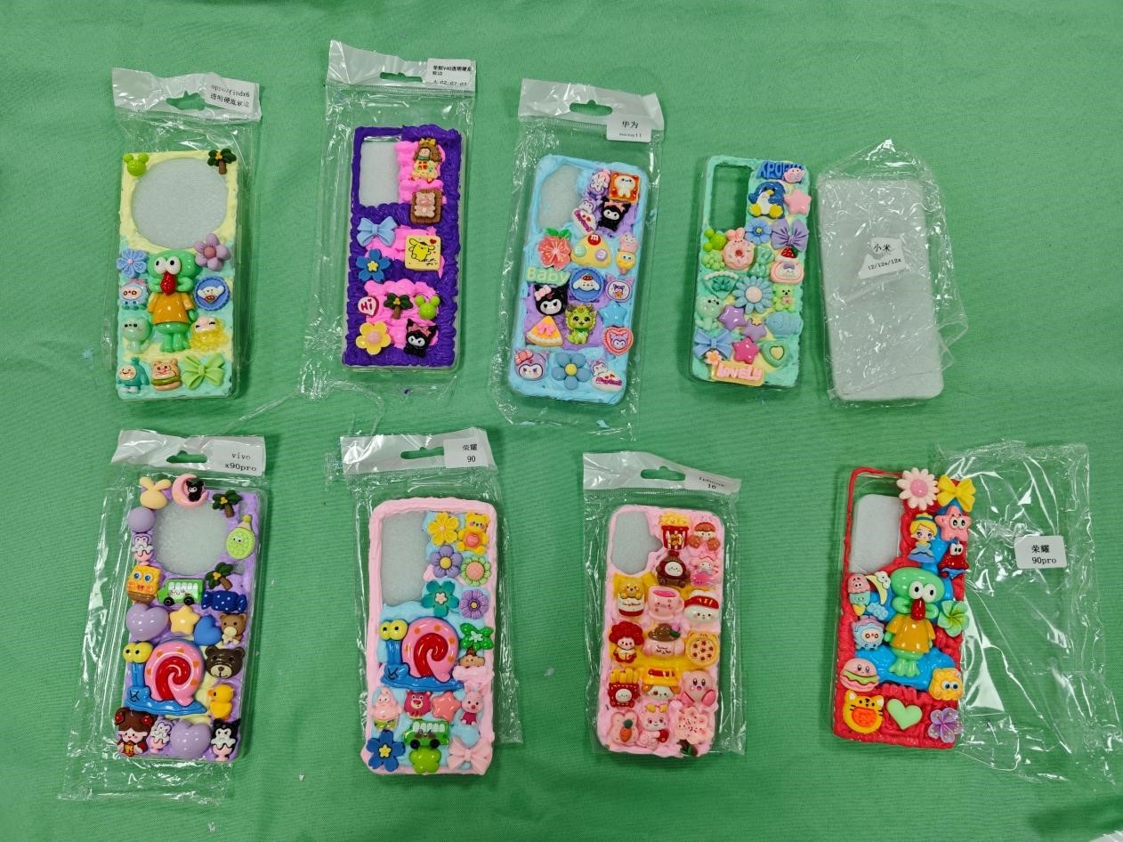 在产品种类研发与制作环节方面,社工开展相关制作步骤与色彩搭配教学,参与者以两人一组的协作方式共同制作。在社工们的指导下,共完成帽子、服装、背包等3种以品牌主LOGO刺绣工艺及手机链、背包挂饰、奶油手机壳、贝壳相框等7种手工饰品。