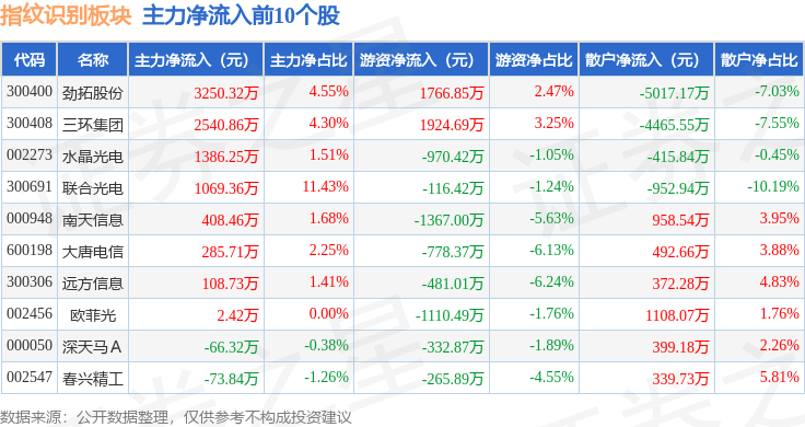 从资金流向上来看,当日指纹识别板块主力资金净流出9.1亿元,游资资金净流入1.99亿元,散户资金净流入7.11亿元。指纹识别板块个股资金流向见下表: